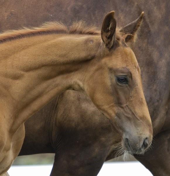 Birth report: What do you get when you breed and dark brown mare to a dark brown stallion?- CHESTNUT. Despite the color surprise, he is one of our favorite foals this season. He is tall, long-legged and a really super mover.